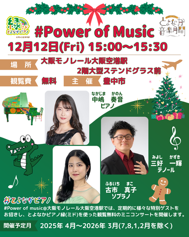 とよなかピアノ事業では音楽とともに皆さまに元気と笑顔をお届けしたく「#Power of music」と題し、市内に設置しているストリートピアノ「とよなかピアノ緑(ミド)」と「とよなかピアノ宙(ソラ)」を使用したストリートピアノコンサートを実施しています。
