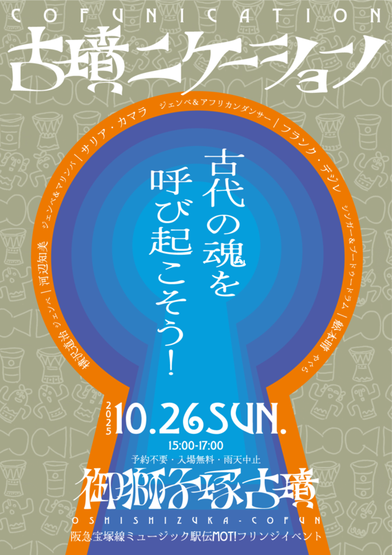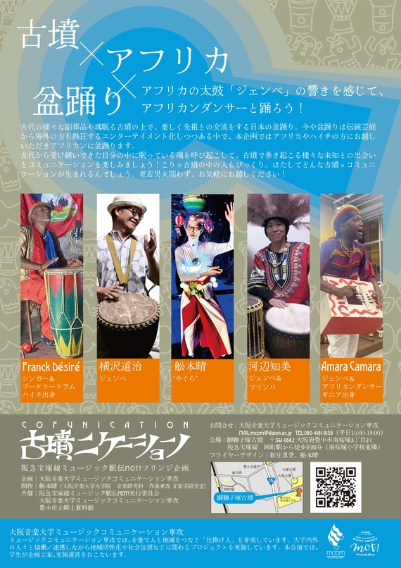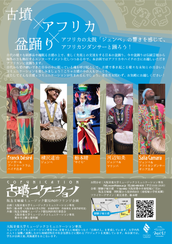 古墳×コミュニケーション=『COFUNICATION』は、古墳×アフリカ×盆踊りという新たな組み合わせの中で、地域の繋がり、古代との繋がりを感じてもらうため、御獅子塚古墳の墳丘で行われる、大阪音楽大学との共催イベントです。