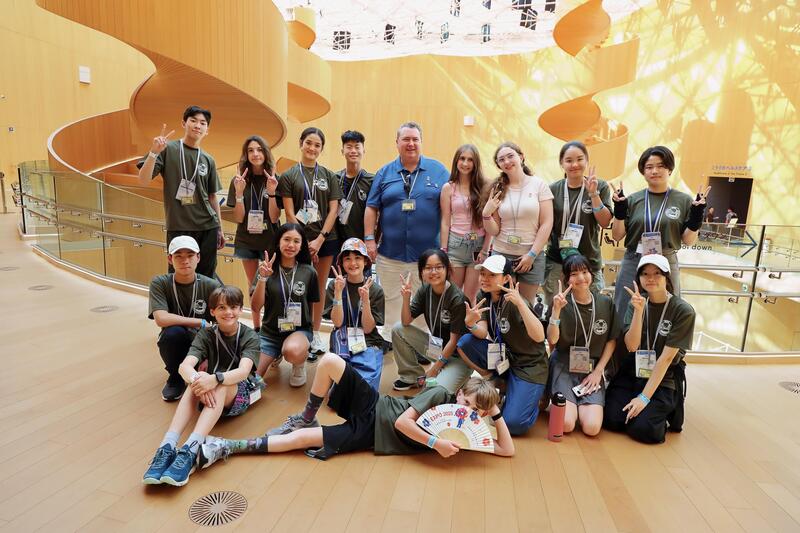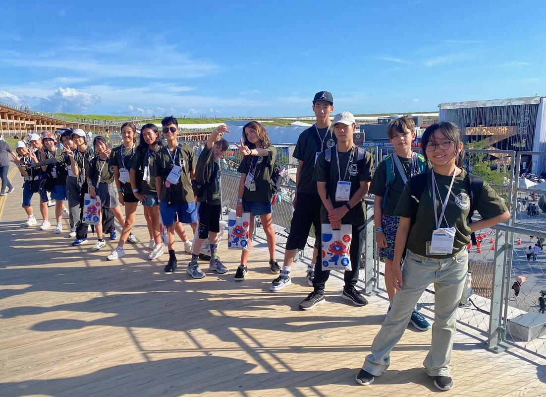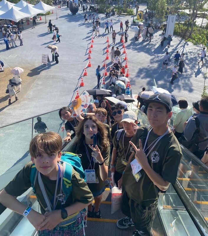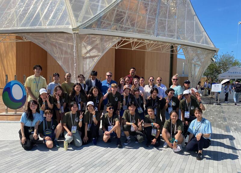 晴れ渡る空の元、いよいよ大阪関西万博会場へ。アメリカパビリオンや大阪ヘルスケアパビリオン、未来の都市などいくつかのパビリオンも体験することができました。中でも、大阪ヘルスケアパビリオン内でのリボーン体験は学生たちにインパクトを残した様子。アメリカ合衆国ナショナルデーの式典も観覧させてもらいました。写真は大阪ヘルスケアパビリオンの前で。