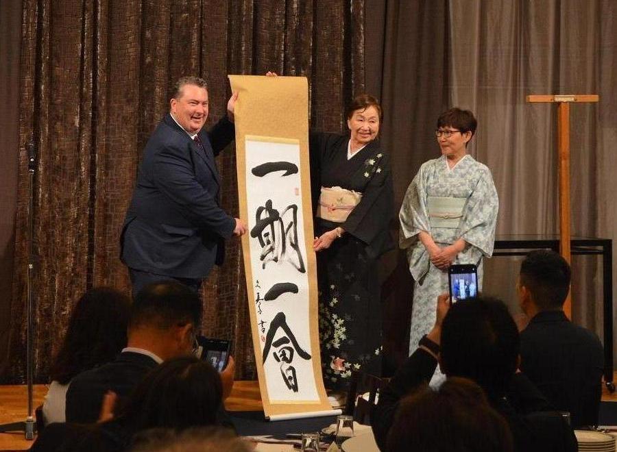 出谷くみこさん書の「一期一会」の掛け軸。「サンマテオの日本庭園の茶室に飾るよ」とニューサム市長。
