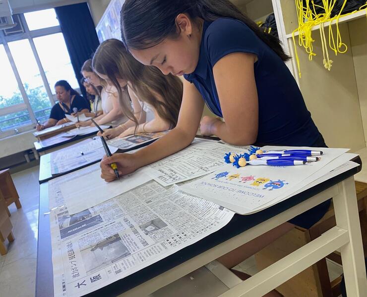 美術の授業で漢字にオリジナルのデザインを加えて筆ペンで書きおろします。