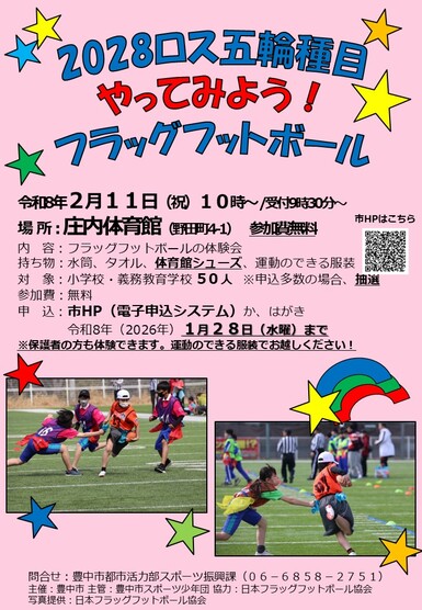 はがき(一人1枚)に「催し名・名前(ふりがな)・郵便番号・住所・電話番号・学年・フラッグフットボールの経験」を書き、豊中市都市活力部スポーツ振興課(〒561-8501豊中市中桜塚3-1-1)まで郵送。