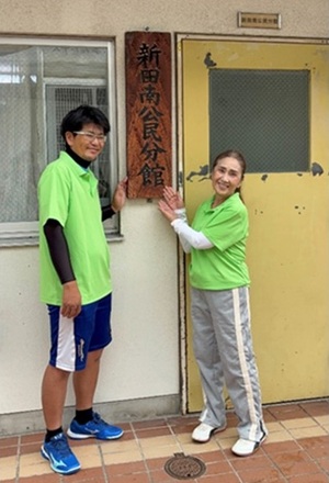 今回は、新田南公民分館が開催する市民体育祭に参加し、18年間公民分館長を務めた山内前公民分館長と、今年からその役目を引き継いだ酒井公民分館長に、