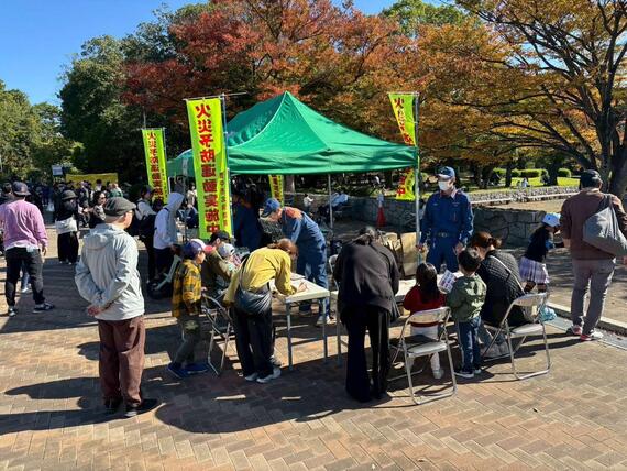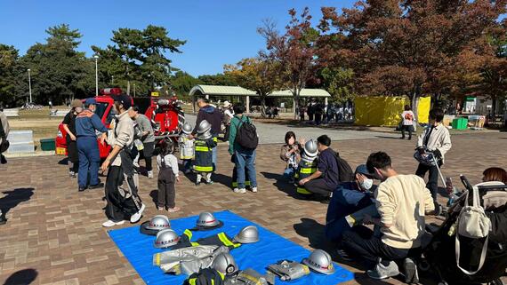 私たち新規採用職員は「わがまち体験研修」の一環で、服部緑地公園で開催された消防ふれあいフェスタの運営補助を行いました。