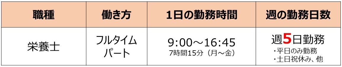 | 勤務時間 | 9:00~16:45(うち休憩45分) |