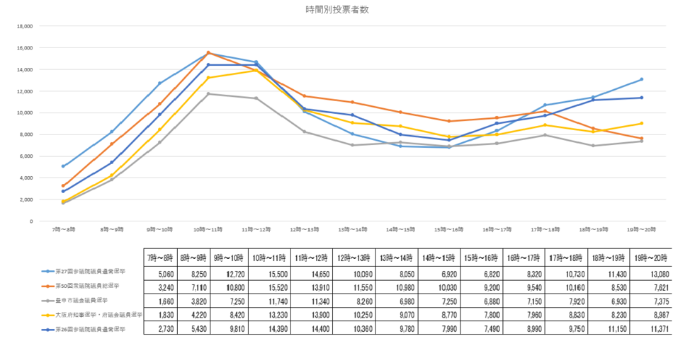 左のグラフは直近で執行された各選挙の当日投票所における時間別投票者数の推移を示しています。