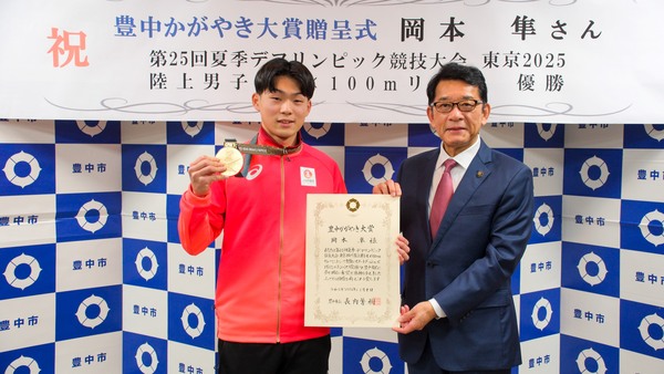 豊中市出身で近畿大学2年生の岡本隼さんが、令和7年11月15日~26日に東京で開催された第25回夏季デフリンピック競技大会 東京2025の陸上男子4×100mリレーの第一走者として出場し、見事に優勝され、金メダルを獲得されました。