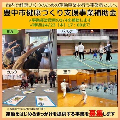 豊中市内で、主に健康づくりのための運動事業を行う団体(市民公益団体、個人事業主、法人・企業)の申込みを募集いたします。