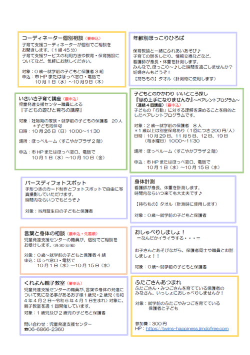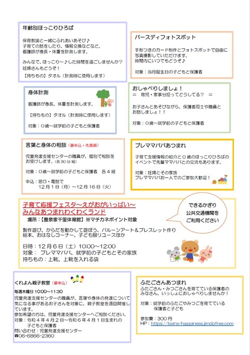 イベント・講座などの日程・お申込み方法等詳しくは、月の予定、子育ち・子育て応援アプリ「とよふぁみby母子モ」をご覧ください。