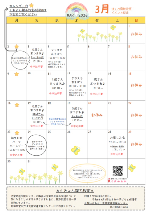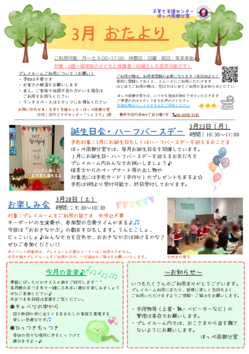 電話:06-6398-9185(子育て支援センターほっぺ南部分室)