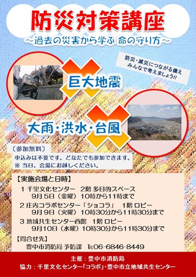 そして、大規模地震の発生が危惧される今、全国各地で発生した地震を含む様々な自然災害について知識を高め、命を守る備えについて皆さんと共に考える「防災対策講座」を市内3か所で開催します。