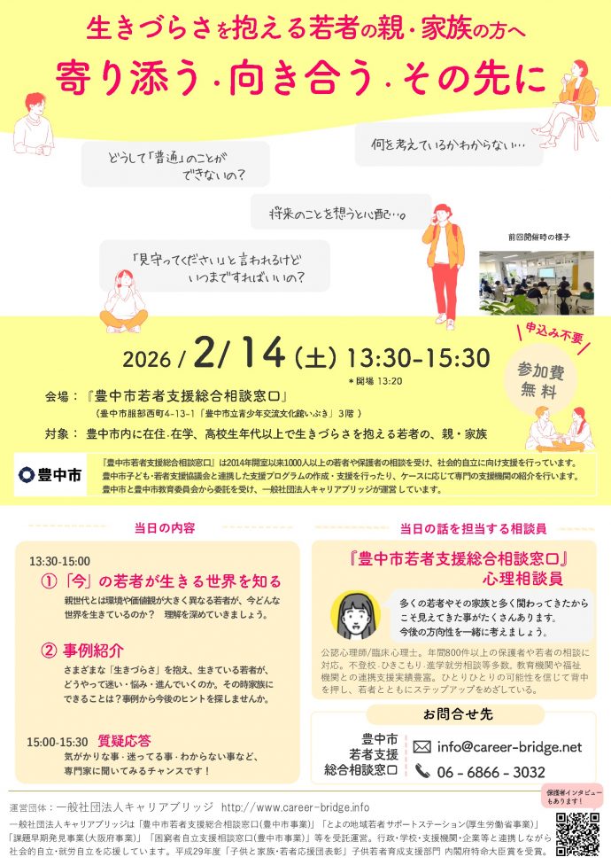 豊中市内に在住・在学、高校生年代以上で生きづらさを抱える若者の親・家族