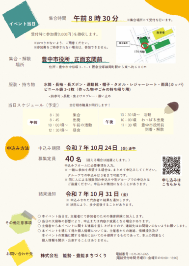 服装・持ち物:長袖、長ズボン、運動靴、帽子、水筒、タオル、レジャーシート、雨具(カッパ)、ビニール袋2~3枚