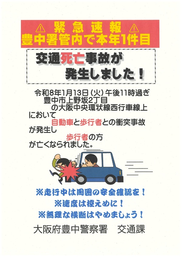 豊中市内で令和8年1件目となる交通死亡事故が発生しました。