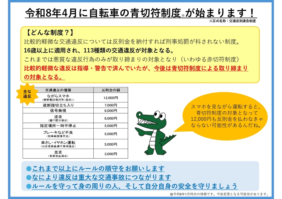令和8年4月1日に、信号無視や一時不停止、ながらスマホ、右側通行等の悪質危険な違反に対して、交通反則通告制度(青切符)が施行されます。