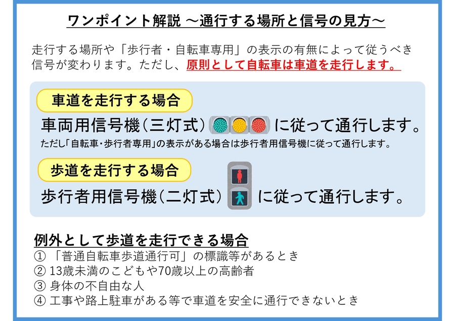 1.車道が原則、左側を通行 歩道は例外、歩行者を優先