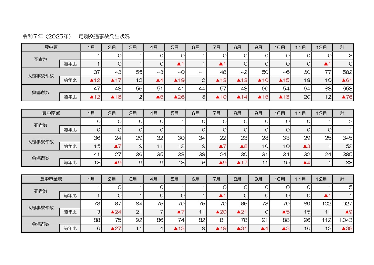 豊中市における令和7年月別交通事故発生状況(12月末時点)(PDF:28KB)