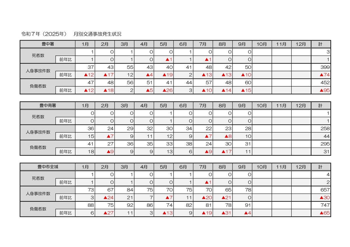豊中市における令和7年月別交通事故発生状況(9月末時点)(PDF:28KB)