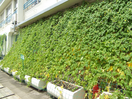 「みどりのカーテンプロジェクト」では、緑化の推進をはじめ、室内の温度を3~4度下げてヒートアイランド現象を緩和するといった地球温暖化防止策の一つとして、小学校を中心に、葉が大きくて成長が早いゴーヤなどを使ったみどりのカーテンづくりの支援に取り組んでいます。また、理科の教科書にある「ツル性植物の育て方」の授業や、自分で育てたゴーヤを活用した食育など、幅広い分野の学習に役立てられています。