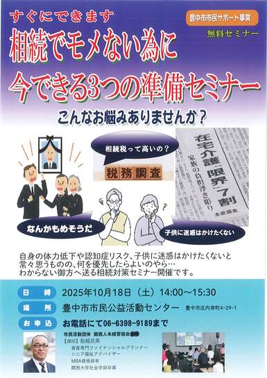 内容:「長男には多めに配分したい」「あの土地は譲れない」など、相続のあれこれで整理できずモメるときどうすればいいのか?「想い」×「お金」を「カタチ」にする相続対策セミナーです。