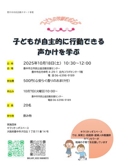 内容:子どもの育ちに悩みを抱える保護者の皆様へ、しつけではなく自主的に行動できる子どもに育てるアドバイスをします。