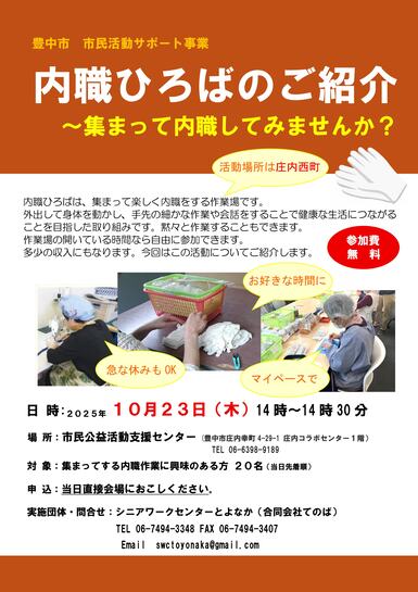 内容:作業所に集まって各自都合の良い時間にそれぞれのペースで内職作業を行ってもらい、工賃をお支払いしています。その取り組みの趣旨についての紹介と個別相談を行います。