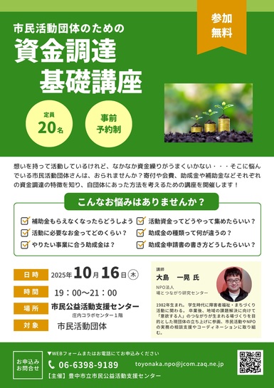 内容:想いを持って活動しているけれど、なかなか資金繰りがうまくいかない…そこに悩んでいる市民活動団体さんは、いらっしゃいませんか?寄付や会費、助成金や補助金など、それぞれの資金調達の特徴を知り、自団体にあった方法を考えるための講座を開催します。