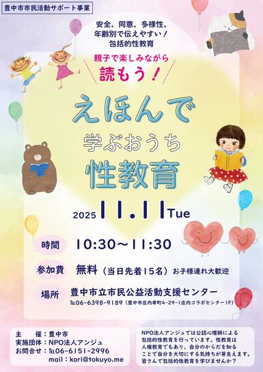 内容:えほんを通して、お家でできるお子さんへの性教育について学びませんか。お子さんたちの性の悩みにもお答えします。