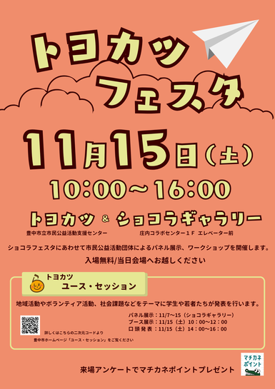 内容:「 市民公益活動団体情報」に掲載の市民公益活動団体による、ワークショップとポスター展示を行います。トヨカツフェスタはショコラフェスタ、 トヨカツ・ユース・セッション2025と同日開催です。両イベントにもぜひお越しください。