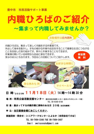 内容:作業所に集まって各自都合の良い時間にそれぞれのスペースで内職作業を行ってもらい、工賃をお支払いしています。その取り組みの趣旨についての紹介と個別相談を行います。