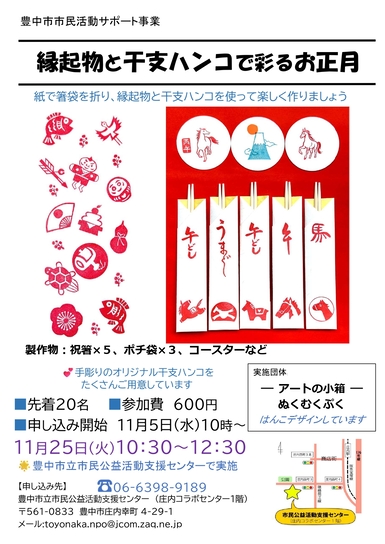 内容:たくさんのオリジナルはんこを自由に押して、祝いばし、ポチ袋、コースタなどを作りましょう。