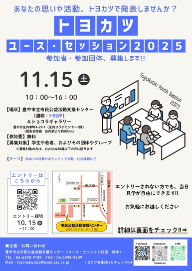 内容:トヨカツ・ユース・セッション2025は、豊中市内外で活動する若者や学生、およびその団体やグループの活動を支援するとともに、若者世代へのボランティアや市民活動の普及促進を目的とするイベントです。当日見学自由、入退場自由です。ぜひ見学にお越しください。