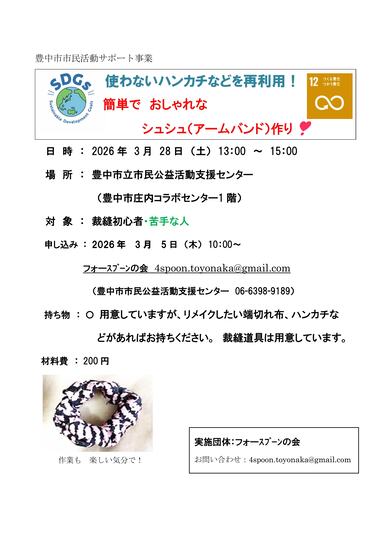 内容:使わなくなったハンカチなどで、簡単でおしゃれなシュシュ(アームバンド)を作ろう!裁縫が苦手な方、春休み中の小中学生も参加OK!