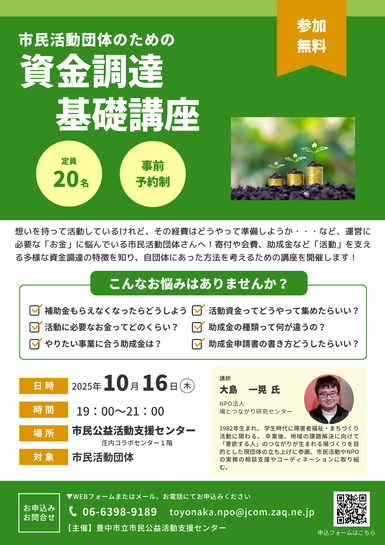 想いを持って活動しているけれど、なかなか資金繰りがうまくいかない…そこに悩んでいる市民活動団体さんは、いらっしゃいませんか?寄付や会費、助成金や補助金など、それぞれの資金調達の特徴を知り、自団体にあった方法を考えるための講座を開催します。