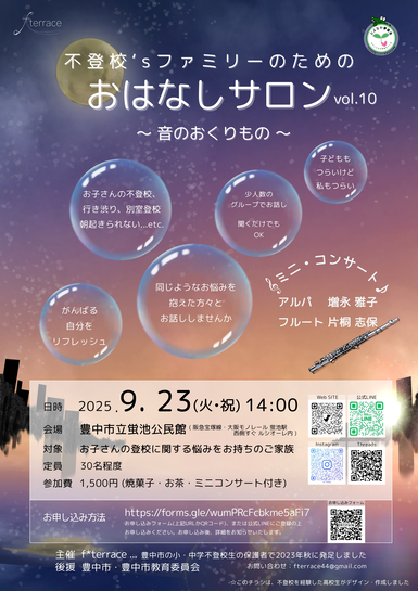 ミニ・コンサート付き「不登校の親の会」を実施します。ここには”仲間”がいます。同じ境遇の方とお話し共感できることで気持ちが楽になり、情報を得て前向きに考えられるようになったり、前進するきっかけとなったりします。おはなし+お菓子とお茶でリラックス+プロの音楽家による生演奏で気晴らしになれば幸いです。