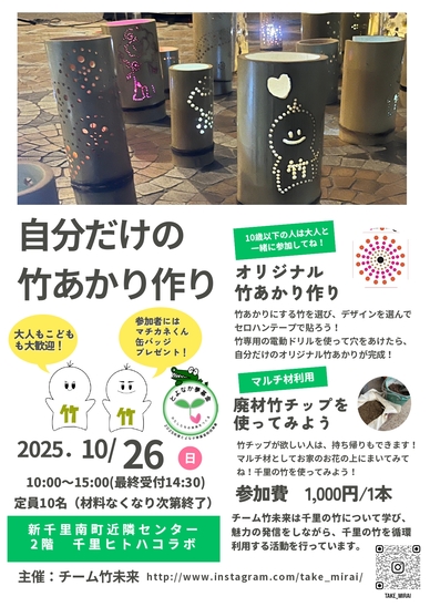 千里の竹魅力発信方法の一つとして竹あかり制作事業を行い、竹にふれる体験の場を提供しながら、竹あかり制作過程で発生する廃材竹チップを堆肥化し、植物を育て植物発電を行い、新たな循環利用を模索します。