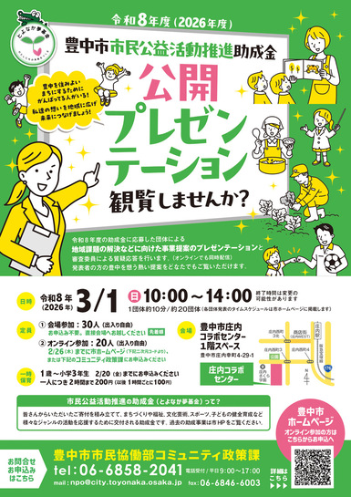 令和8年度(2026年度)の市民公益活動推進助成金(とよなか夢基金助成金)への応募を考えている方に向けた、説明会・相談会を実施します。