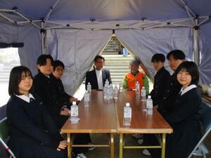 ・開明高等学校の生徒が訓練の運営に地域住民とともに携わりました。また、訪問された市長に対して、各生徒からインタビューを行いました。