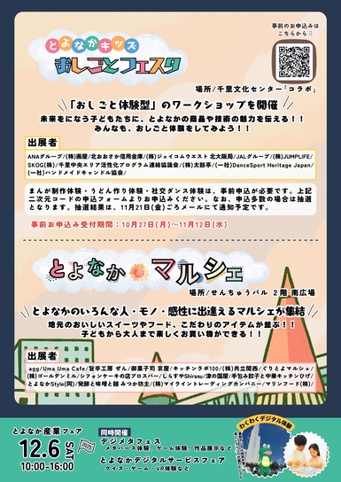 お仕事体験やワークショップを楽しめる「とよなかキッズおしごとフェスタ」や、地元で愛される商品を味わう「とよなかマルシェ」を開催します。
