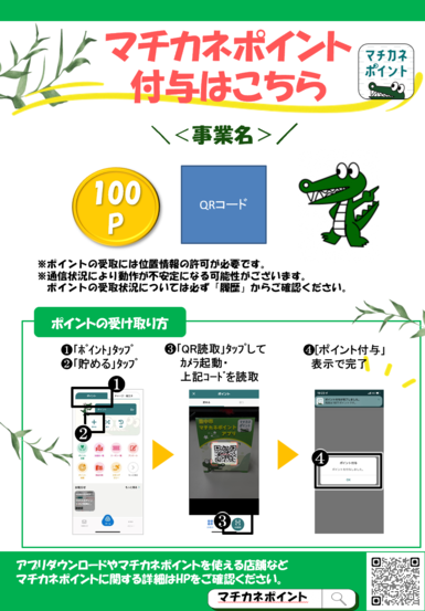 (マチカネポイントは、市内加盟店舗で1ポイント1円としてご利用いただけます。詳しくは、こちらをご覧ください。)