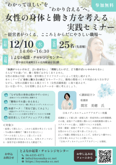12月10日開催 ”わかってほしい”を”わかり合える”へ。女性の身体と働き方を考える実践セミナー~経営者がつくる、こころとからだにやさしい職場~