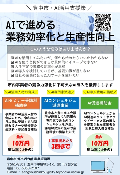 市内事業者が抱える、集客・営業・事務効率等のAIに関する課題解決を支援するため、豊中商工会議所と連携し、1事業者につき3回を上限として、「AIコンシェルジュ」を派遣します。