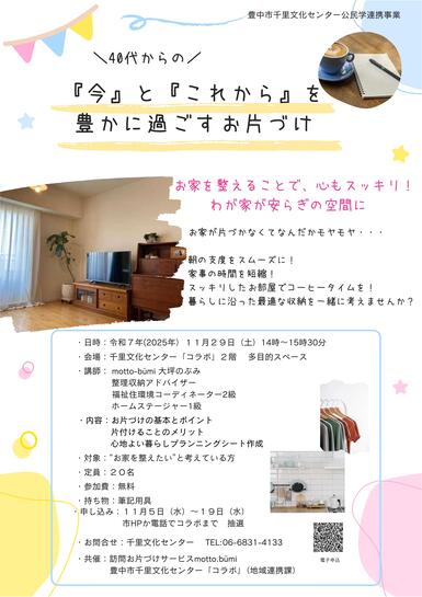 【千里文化センター公民学連携事業】40代からの「今」と「これから」を豊かに過ごすお片づけ(11月29日)【要申込】