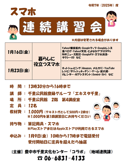 スマホ連続講習会(1月16日・1月23日)【要申込】