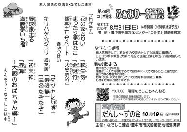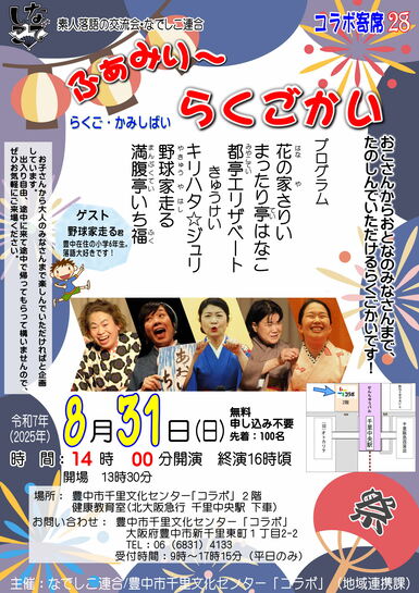平成30年(2018年)から、豊中市千里文化センター「コラボ」と一緒になって、地域のみなさんの「笑いによる交流の機会」と「心と身体の健康づくり」に向けた取り組みの一環として「コラボ寄席」の企画・運営をいただいています。