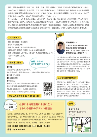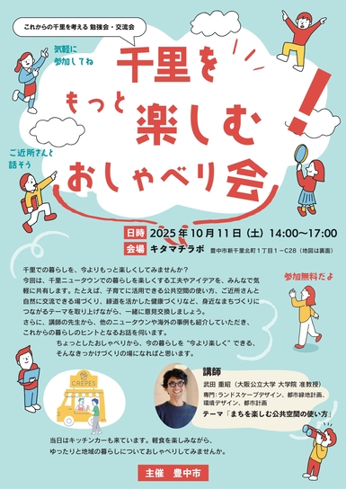 豊中市では、平成31年(2019年)に策定した「千里中央地区活性化基本計画」に基づき、千里中央駅周辺では商業エリアの建物の更新などの再整備を検討しています。この計画では、千里の地域に住み、働く人の暮らしを豊かにするために、住民と事業者が協働してエリアマネジメントの取り組みを行うまちづくりの方針が示されています。そこで、千里地域の豊かな暮らしの実現に向けて、たくさんの方に参加・参画していただき、一緒にまちをつくっていきたいと考えています。令和4年度に市民向けワークショップを実施し、みなさまのご意見をお聞きし、令和5年度に入ってからは地域の自治会や地元企業の方々にもご意見を賜りました。自分がこのまちで楽しく、幸せに暮らしていくために、まちが変わり始めるこのタイミングで、まちのことを一緒に考えましょう。