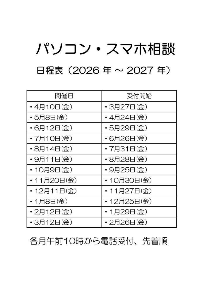 | 令和9年(2026年)3月12日(金曜) | 令和9年(2027年)2月26日(金曜)午前10時から電話受付、先着順 |