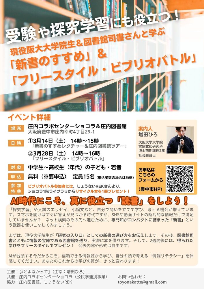 公民学連携 南部まちなか活性化プロジェクト【現役阪大大学院生&図書館司書さんと学ぶ「新書のすすめ」&「フリースタイル・ビブリオバトル」】(3月14日・28日)