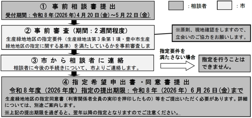 事前相談後に提出していただく申出書の提出期限(令和8年(2026年)6月26日(金曜)まで)を考慮し、お早めにご相談ください。