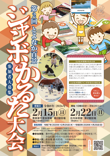 かるた遊びをとおして、楽しみながら豊中市の魅力的な景観を知り、親しみを感じていただくきっかけとなることを目的として、下記のとおり「第2回とよなか百景ジャンボかるた大会」を開催いたします。